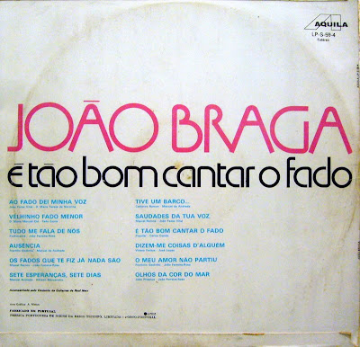 DISCOGRAFIA::: É Tão Bom Cantar o Fado (EP, Aquila, 1967) *** Tive um Barco (EP, Aquila, 1967) *** Sete Esperanças, Sete dias (EP, Aquila, 1967) *** Jardim Abandonado (EP, Aquila, 1967) *** A Minha Cor (LP, Aquila, 1967) *** Recado a Lisboa (EP, Philips, 1968) *** João Braga Fados (LP, Philips 1969) *** Praia Perdida (EP, Philips, 1969) *** Rua da Sombra Larga (EP, Philips, 1970) *** Que Povo É Este, Que Povo? (LP, Philips, 1970) *** João Braga Canta António Calém (LP, Philips, 1971) *** El Fado (LP, 1972) *** Amor de Raiz (Single, Philips, 1972) *** Canção Futura (LP, Orfeu, 1977) *** Miserere (LP, Orfeu, 1978) *** Arraial (LP, Valentim de Carvalho, 1980) *** Na Paz do Teu Amor (LP, Sasseti, 1982) *** Do João Braga Para a Amália (Lp, Sasseti, 1984) *** Portugal / Mensagem de Pessoa (LP, Sasseti, 1985) *** O Pão e a Alma (LP, Silopor, 1987) *** Terra de Fados (CD, Edisom, 1990) *** Cantigas de Mar e Mágoa (CD, Edisom, 1991) *** Em Nome do Fado (CD, Strauss, 1994) *** Fado Fado (CD, BMG 1997) *** Dez Anos Depois (CD, BNC, 2001) *** Fados Capitais (CD, A Capital, 2002) *** Cem Anos de Fado vol. 1 (CD, Farol, 1999) *** Cem Anos de Fado vol. 2 (CD, Farol, 2001) *** Cantar ao Fado (CD, Farol, 2000) *** Fado Nosso (CD, CNM, 2009) *** COMPILAÇÕES *** O melhor dos melhores nº 28 (CD, Movieplay, 1994)